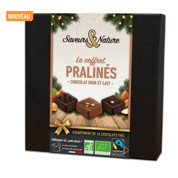 chocolat noir* (pâte de cacao*, sucre de canne*, beurre de cacao*), praliné NOISETTE* : 33.8% (NOISETTES* : 16.9%, sucre de canne*), chocolat au LAIT* (sucrede canne*, beurre de cacao*, poudre de LAIT entier*, pâte de cacao*), praliné AMANDE* : 7.6% (sucre de canne*, AMANDES* : 3.8%), beurre de cacao*, pâte de PISTACHE* : 2%, praliné SÉSAME* : 0.34% (SÉSAME* : 0.17%, sucre de canne*), fleur de sel : 0.1%, éclats de NOISETTES*, graines de SÉSAME*, chocolat blanc*, poudre de vanille*.