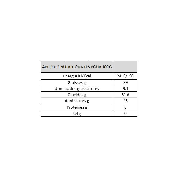 Composée de seulement 2 ingrédients : noisettes de France (56%), et sucre.