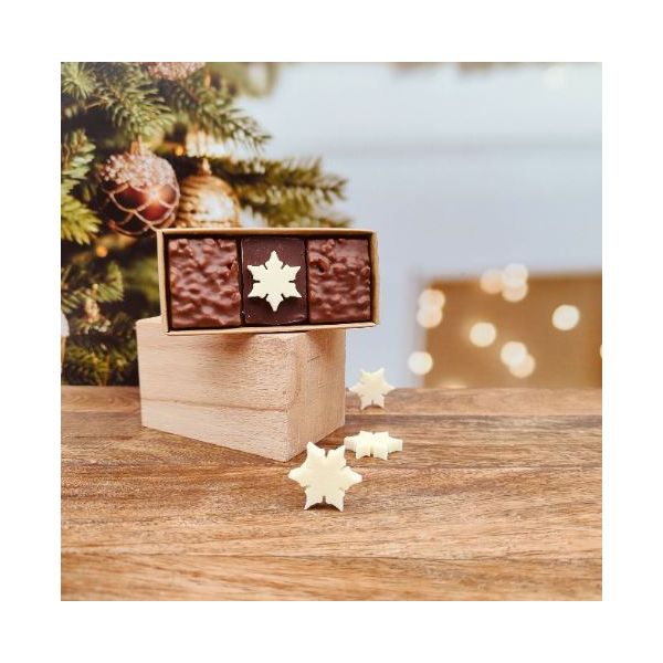 Noisettes origine France / sucre / amandes / chocolat au lait 45% origine Vietnam (pâte de cacao, sucre, beurre de cacao, poudre de lait, arôme de vanille naturelle / chocolat noir 70% origine Equateur (pâte de cacao, beurre de cacao, sucre, arôme de vanille naturelle) / chocolat blanc 35% (beurre de cacao, sucre, poudre de lait, lécithine de soja) / crêpe dentelle (farine de blé, sucre, beurre, lait, huile de tournesol, malt d’orge, sel) / sel