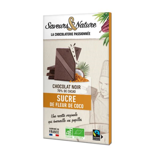 pâte de cacao*, sucre de fleur de coco* : 24%, beurre de cacao*.